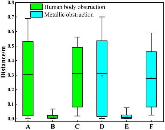 In NLOS scenarios involving both anthropomorphic and metallic line-of-sight obstructions, Figure 10 presents error distribution plots for MLE, AEKF, and traditional KF algorithms. Here, A denotes original ranging data under anthropomorphic obstruction, B represents processed distance measurements from our proposed algorithm under identical anthropomorphic conditions, and C indicates measurements processed by conventional KF filtering under anthropomorphic obstruction. Similarly, D signifies original ranging data under metallic obstruction, E corresponds to processed measurements from our algorithm under metallic obstruction, and F designates measurements processed by traditional KF under metallic obstruction. The proposed algorithm achieves ranging accuracies of 1.82 cm and 1.93 cm under anthropomorphic and metallic obstructions, respectively, with maximum absolute ranging errors of 9.24 cm and 9.83 cm, respectively. Compared to unprocessed ranging data, our method improves ranging accuracy by 93.91% and 93.41% under anthropomorphic and metallic obstructions, respectively. Relative to traditional KF filtering, the proposed algorithm demonstrates accuracy improvements of 93.75% and 93.11% under anthropomorphic and metallic obstructions, respectively.
