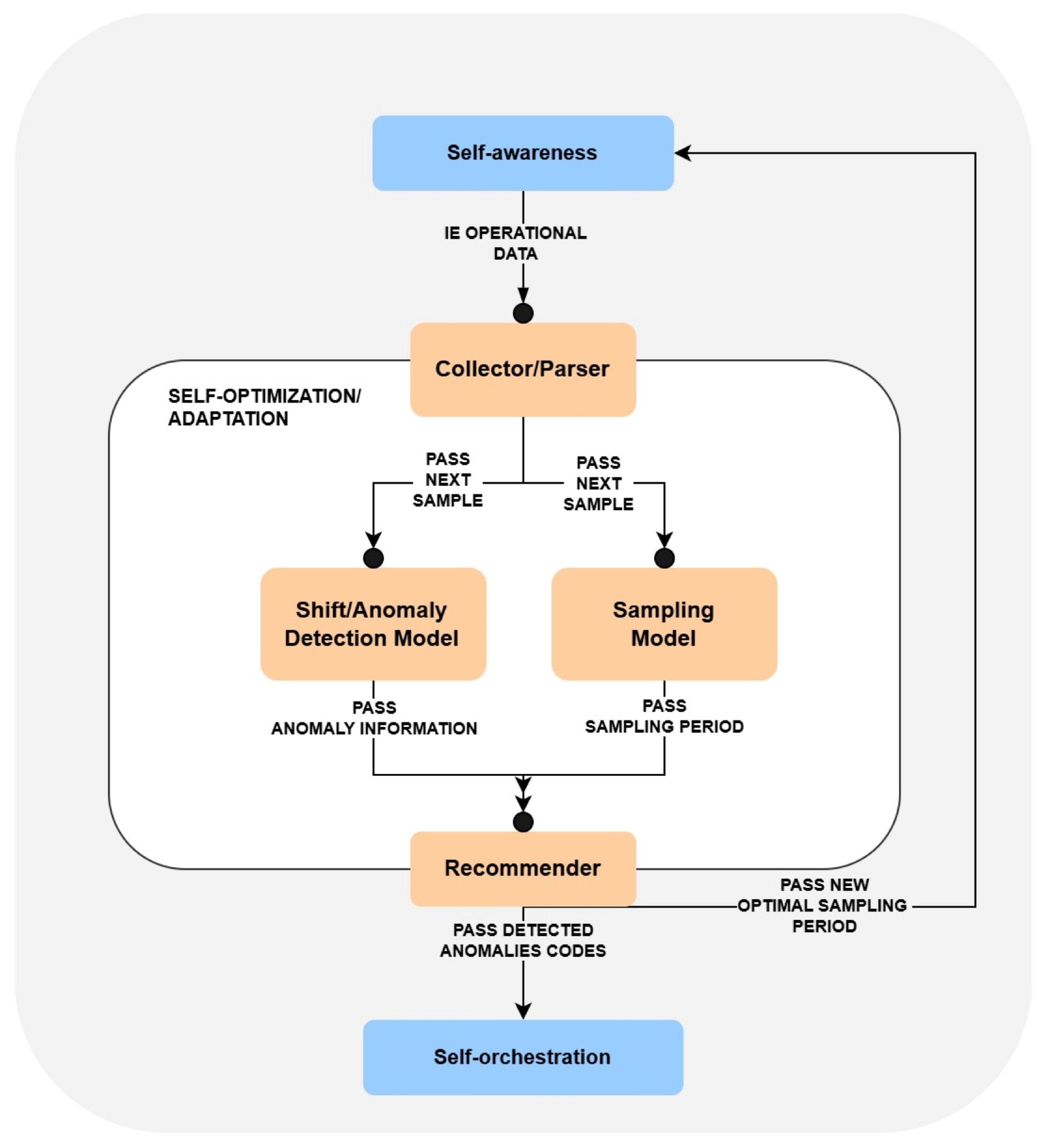 - Employ only frugal techniques: all the implemented algorithms should be computationally efficient and require a minimal amount of storage. This requirement was established to enable deploying self-optimization on a wide variety of IEs, including those operating on small edge devices. Consequently, no additional storage for historical data was considered, which eliminated the possibility of implementing some of the more advanced analytical algorithms. However, it should be stressed that this was a design decision rooted in in-depth analysis of pilots, guiding scenarios, and use cases of aerOS and other real-life-anchored projects dealing with ECC.