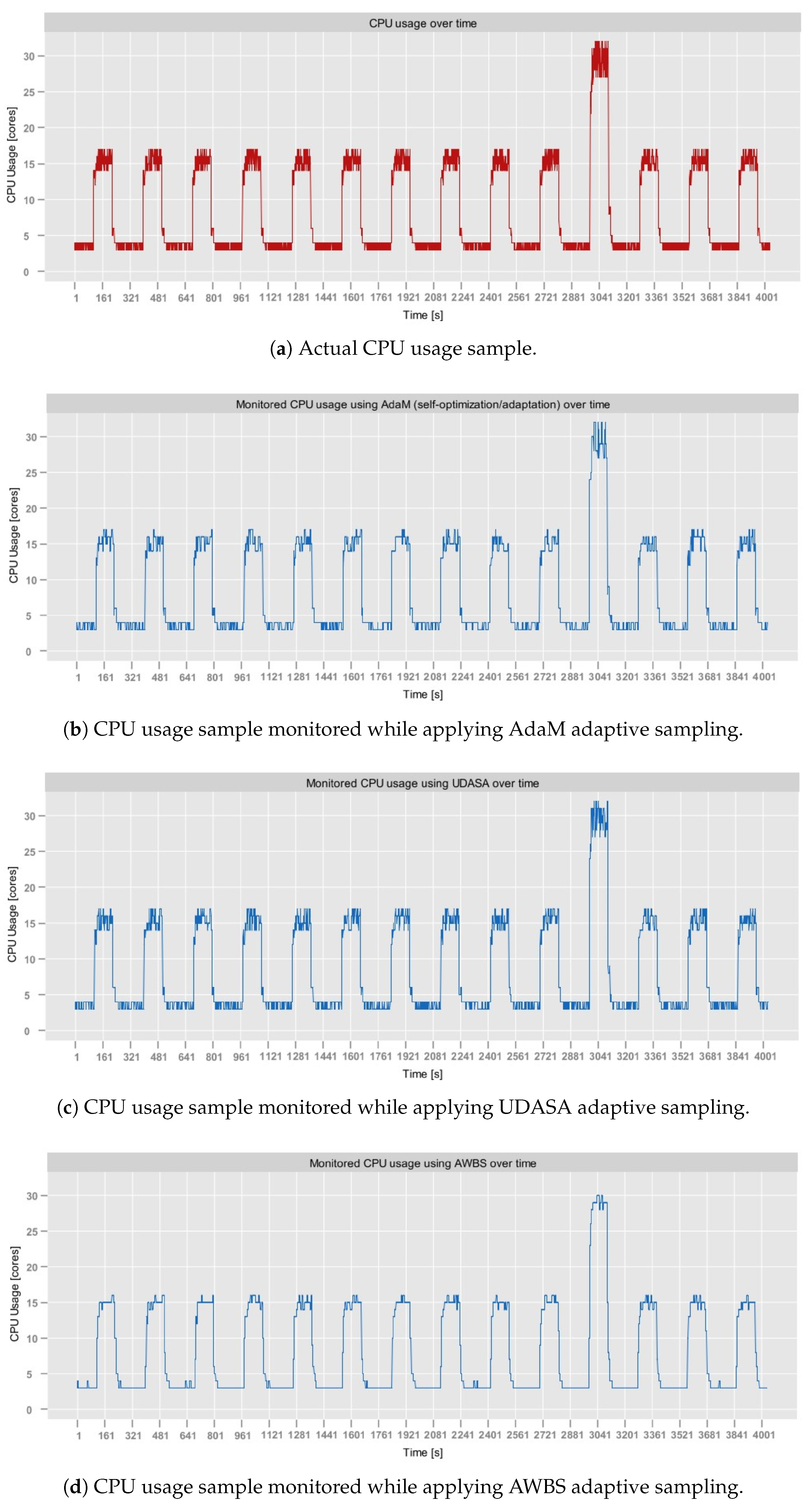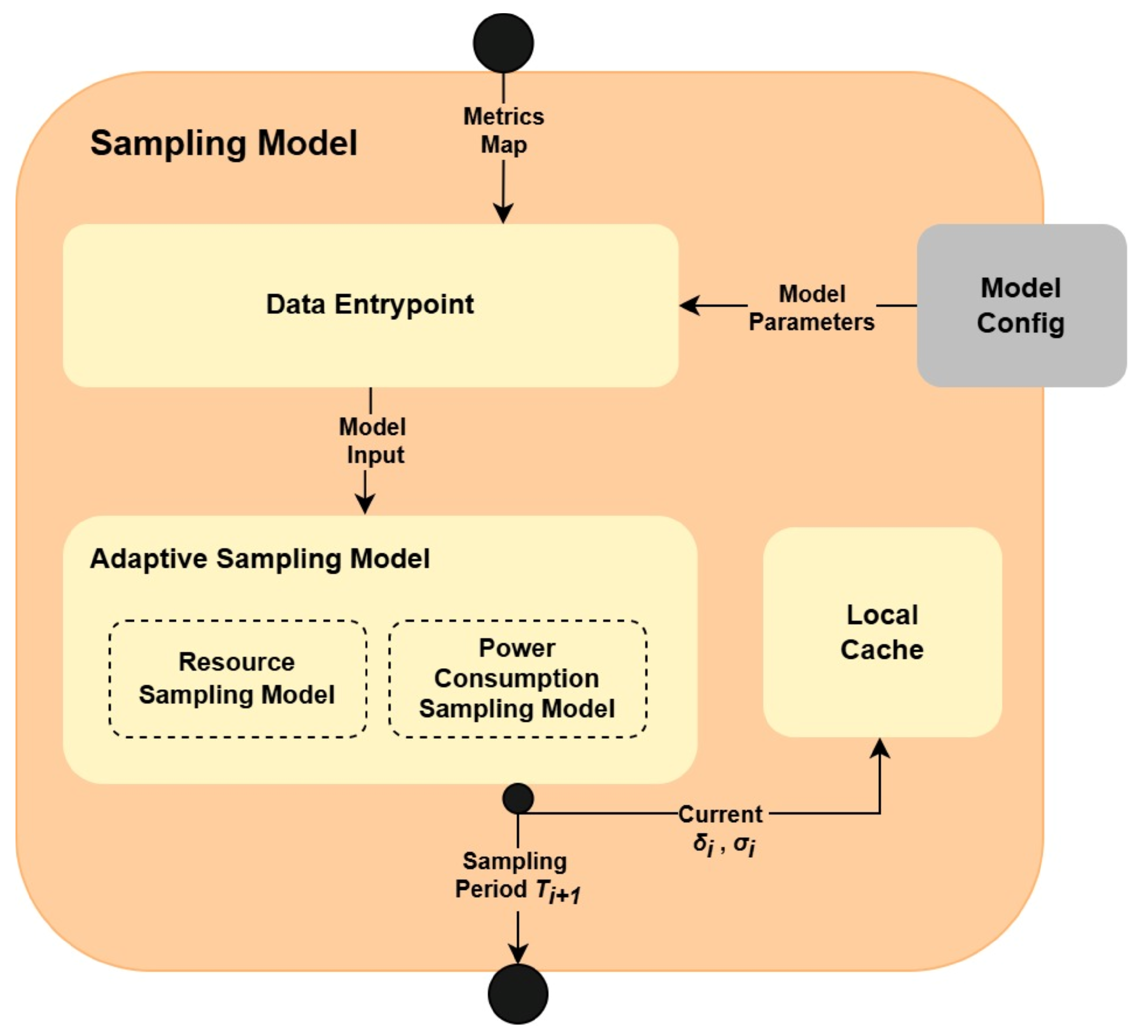 - Adaptive sampling—estimation of the optimal sampling period for the monitoring of resource utilization and power consumption, obtained by analyzing the changes in data distribution with Probabilistic Exponential Moving Average (PEWMA)