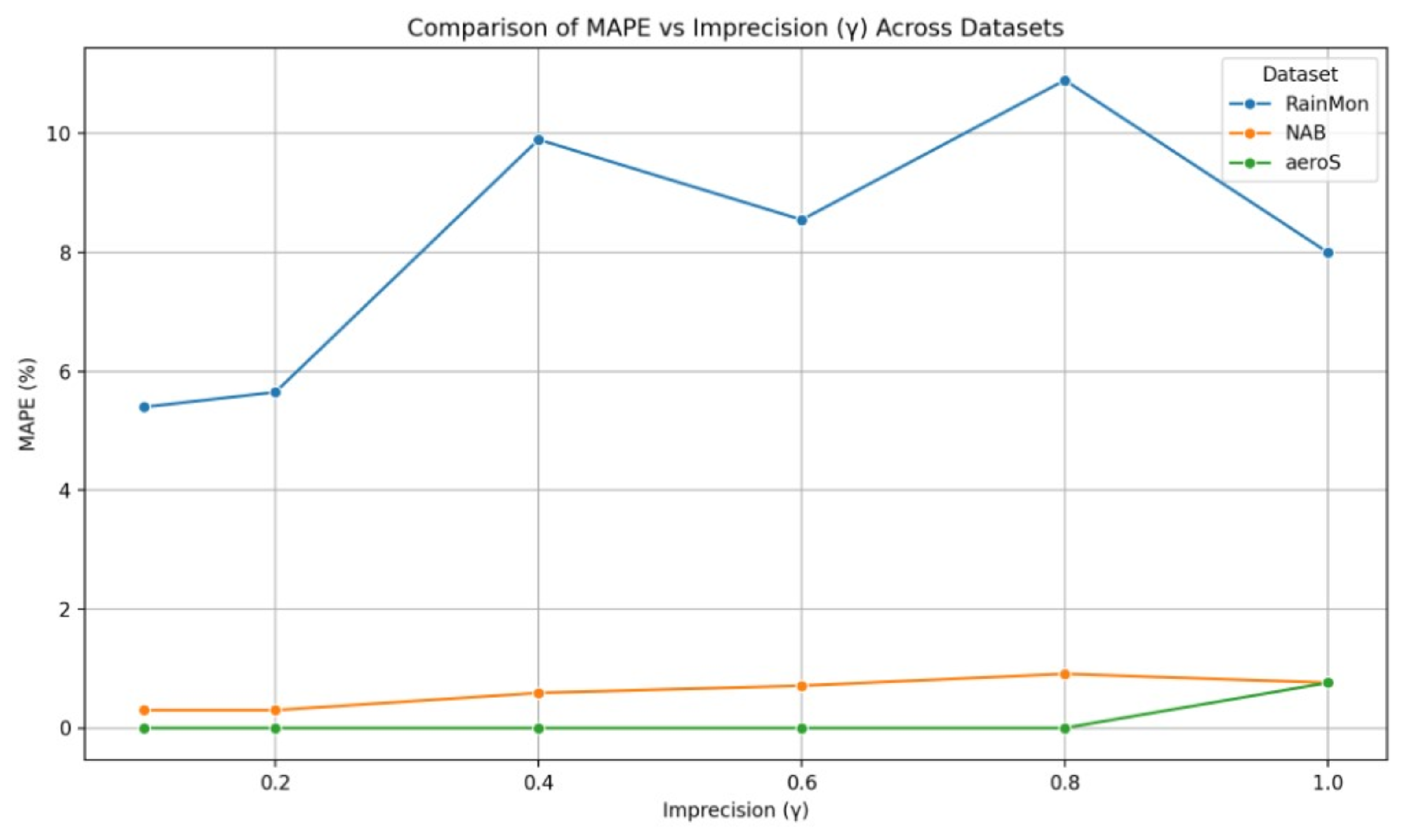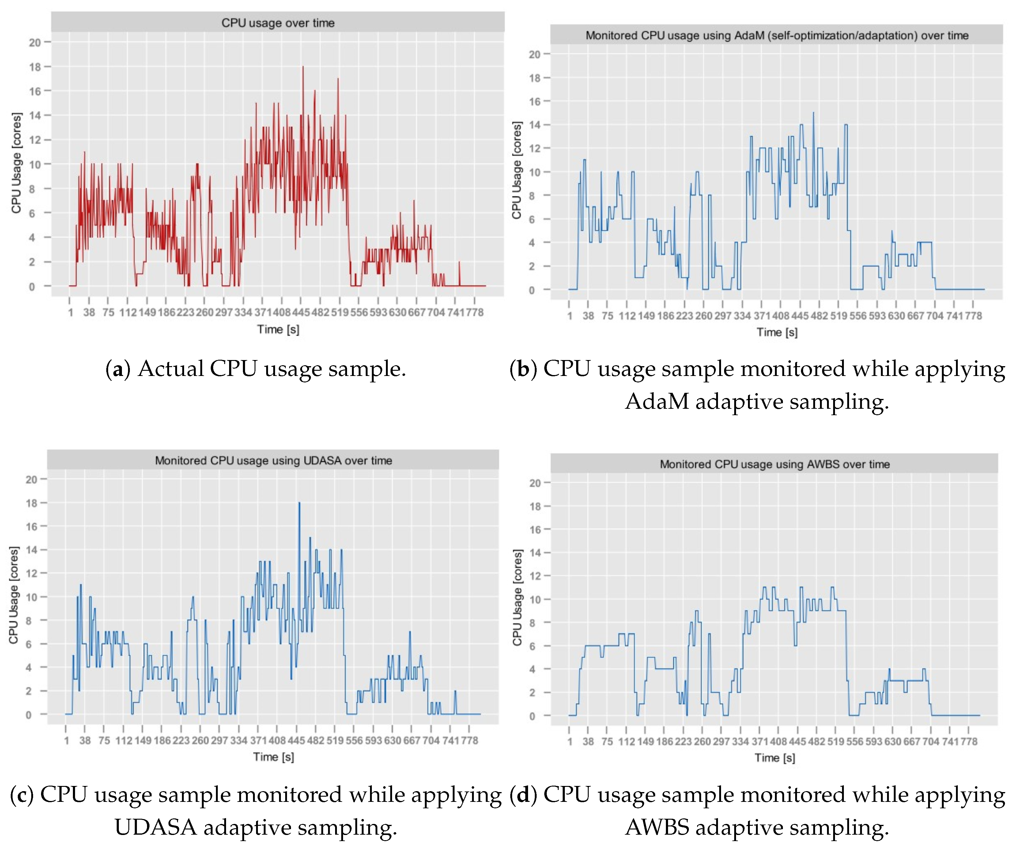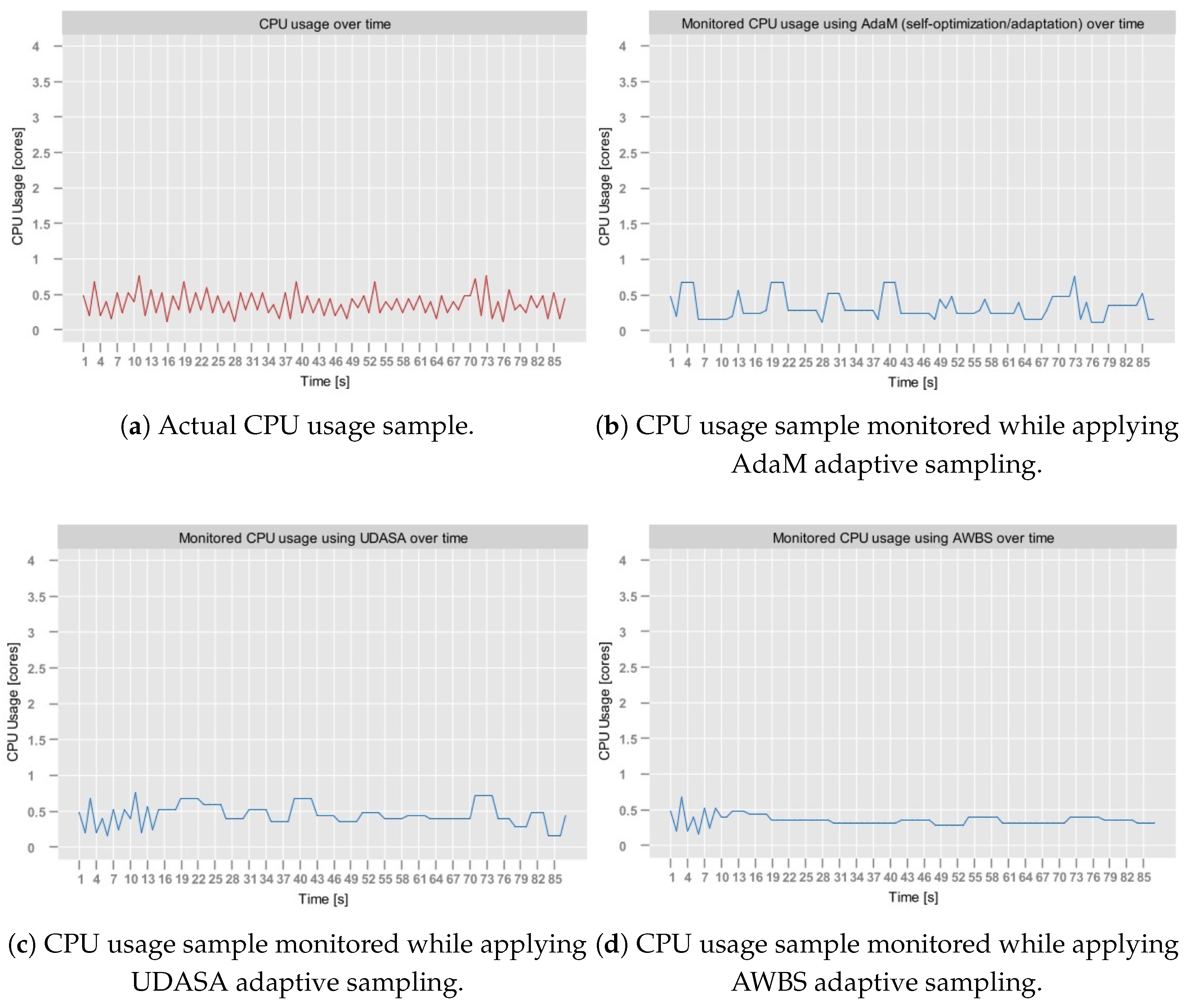 - RainMon monitoring dataset (https://github.com/mrcaps/rainmon/blob/master/data/README.md, access date: 24 October 2025): an unlabeled collection of real-world CPU utilization data that consists of 800 observations. It was obtained from the publicly available data corpus of the RainMon research project [50]. The CPU utilization traces of this dataset exhibit non-stationary, highly dynamic behavior, including multiple abrupt spikes. Therefore, it provides an excellent basis for validating the effectiveness of adaptive sampling in capturing critical variations in monitoring data.