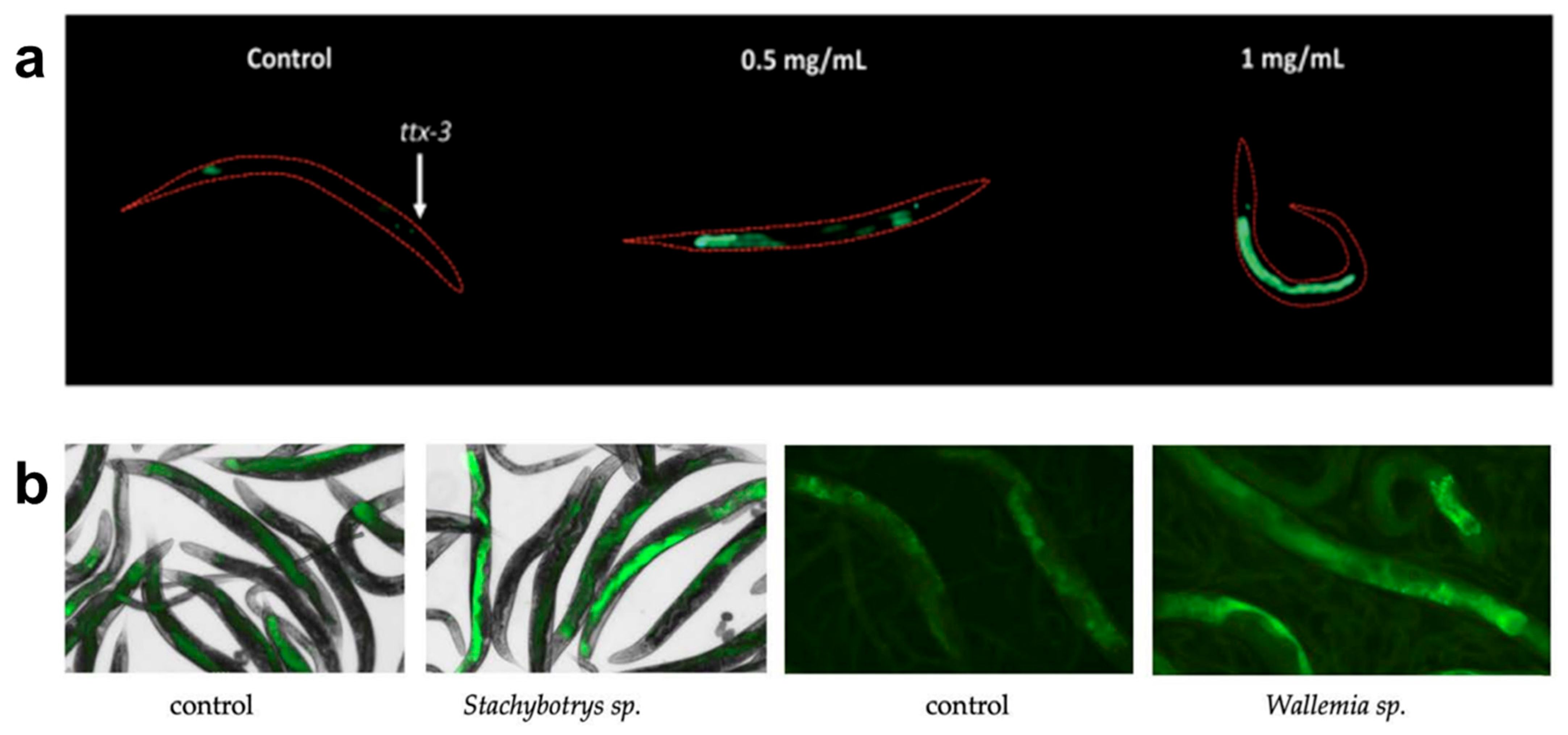 - Pukkila-Worley, R.; Feinbaum, R.; Kirienko, N.V.; Larkins-Ford, J.; Conery, A.L.; Ausubel, F.M. Stimulation of Host Immune Defenses by a Small Molecule Protects C. elegans from Bacterial Infection. PLOS Genet. 2012, 8, e1002733. [Google Scholar] [CrossRef]
