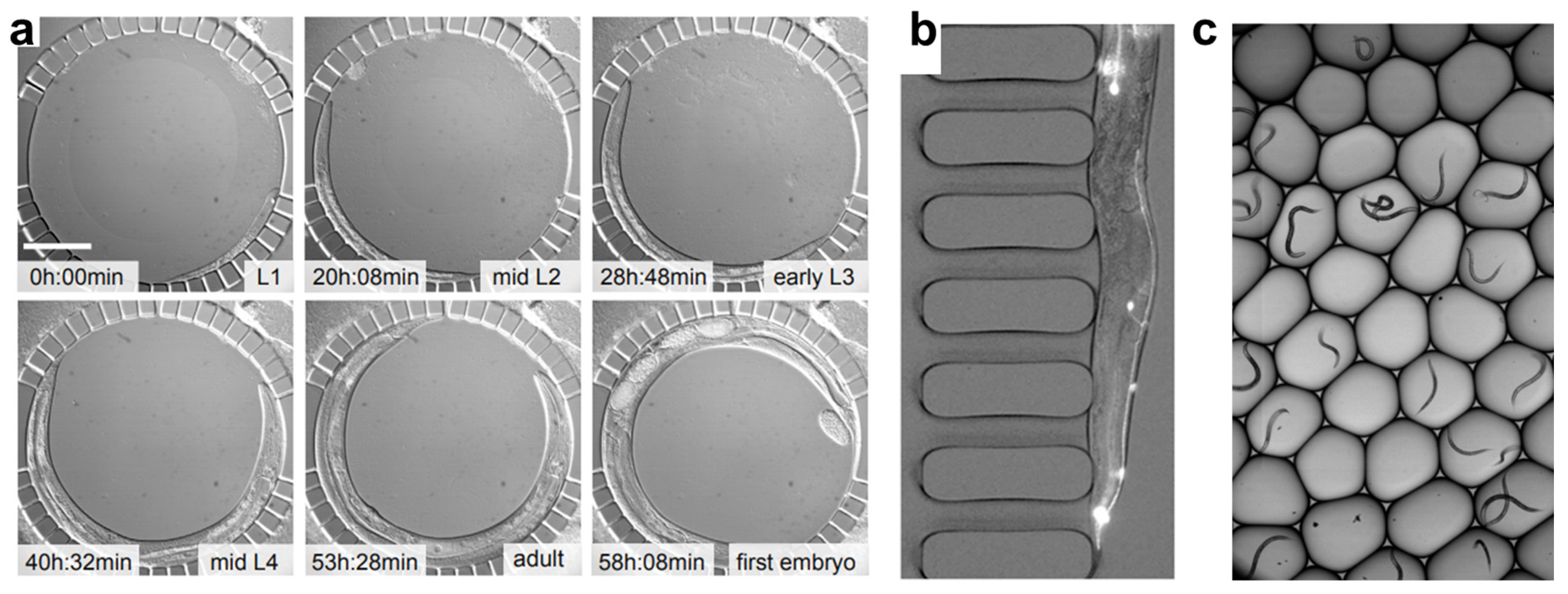 - Hulme, S.E.; Shevkoplyas, S.S.; McGuigan, A.P.; Apfeld, J.; Fontana, W.; Whitesides, G.M. Lifespan-on-a-chip: Microfluidic chambers for performing lifelong observation of C. elegans. Lab A Chip 2010, 10, 589–597. [Google Scholar] [CrossRef] [PubMed]