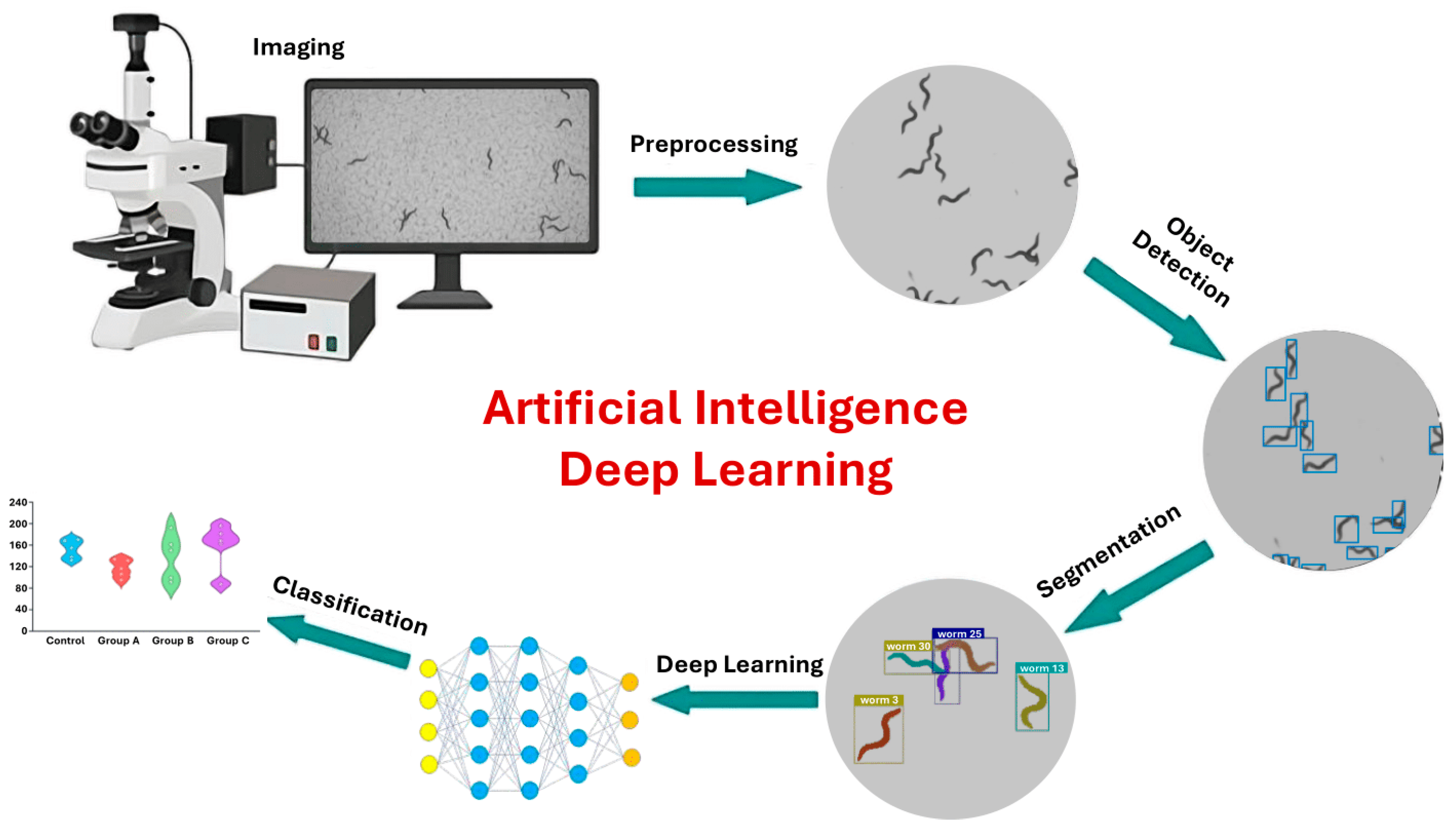 - Lieu, M.; Cao, Q.; Meng, R.; Zhang, D.; Chauhan, V.M. WormAI: Artificial Intelligence Networks for Nematode Phenotyping. bioRxiv 2025. [Google Scholar] [CrossRef]