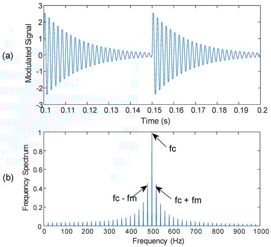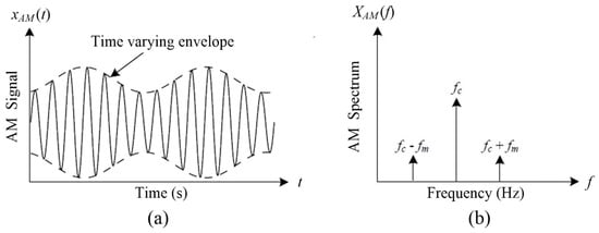 Thus, the AM signal can be represented as the summation of the carrier signal with frequency fc and the modulation sidebands (fc ± fm). Figure 2a illustrates an example of an AM signal with a time-varying envelope and the corresponding frequency spectrum with modulation sidebands. It is seen that the spectral components corresponding to the modulating frequency fm cannot be recognized directly on the spectral map in Figure 2b, but they become sidebands around the carrier frequency fc.
