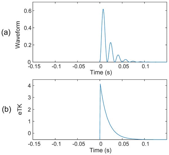 The eTK method takes the standard deviation of the instantaneous energy, which does not change the scale of the signal, to facilitate the analysis. Figure 4a shows a simulated waveform containing some side spikes along the main spike. As illustrated in Figure 4b, the eTK can clearly denoise the signal, smoothen the side spikes, and increase the SNR.
