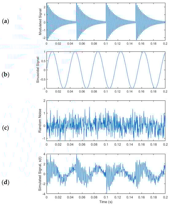 The EMD is an adaptive signal processing method that can be utilized for nonlinear and non-stationary signal processing [21]. To implement EMD, a simulated AM signal is created. The simulated AM signal is simulated, which consists of a modulated signal (Figure 5a), a sinusoidal signal (Figure 5b), and some random noise (Figure 5c) with a magnitude of about 45% of the modulated signal amplitude. Figure 5d shows the final simulated AM signal s(t).
