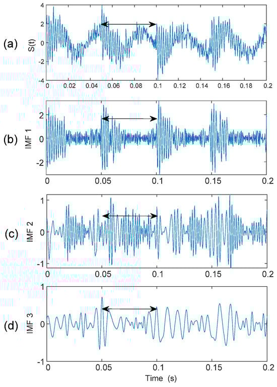 Distortion patterns (shown by a double-sided arrow) present in: (a) the simulated signal, (b) the first IMF, (c) the second IMF, and (d) the third IMF.