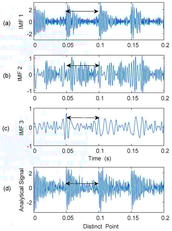 Consider the example in Figure 6. If it is decomposed into nine IMFs, IMF1~IMF9, and a residual, it is seen that only the first three IMFs in Figure 6a–c contains a specific distortion pattern, while other IMFs do not contain a clear, specific distortion pattern (Figure 6d–j). The feature in Figure 6c is not completely periodic, but quasi-periodic, because the extracted IMFs are modulated by other resonance responses and noise. In a bearing signal, for example, features could be quasi-periodic because they are modulated by shaft rotation variations, slips, and load changes.