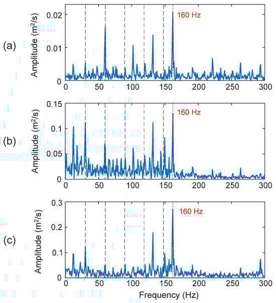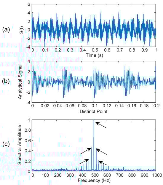 Figure 9 shows the modulated AM signal, the formulated analytical signal, and the spectral spectrum of the analytical signal. It is seen from Figure 9c that the carrier frequency and modulated sidebands can be recognized clearly (specified by arrows). The noise level due to unwanted frequencies is almost negligible in the spectral map. This is because the analytical signal is formulated only from those most representative IMFs that show critical distortion patterns, without considering other noise-related feature distortions. In this example, the simulated AM signal has the first three sequential IMFs containing specific distortion patterns. However, in real-time bearing fault detection, defect-induced distortion may not be present in sequential IMFs, which depend on the bearing’s dynamics and system structures, as illustrated in the tests in the next section.