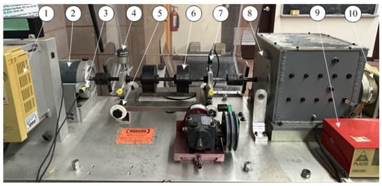 Experimental setup: (1) speed control; (2) drive motor; (3) optical encoder; (4) a smart sensor node; (5) misalignment adjustor; (6) static load; (7) ICP accelerometer; (8) gearbox; (9) load drive system; and (10) load system.