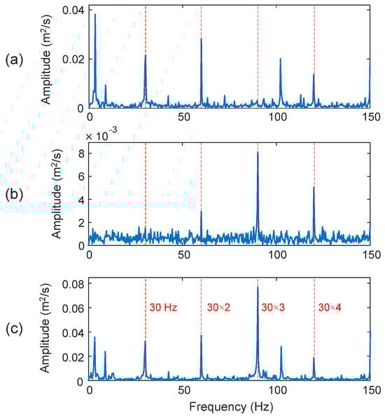 Firstly, the tests are undertaken on a healthy bearing. The bearing characteristic frequency in this case is fH = 30 Hz. Figure 11 shows the processing results using related techniques. The selected IMFs are the first and second IMFs (i.e., IMF1 and IMF2). As shown in Figure 11a, the classical HHT can recognize the characteristic frequency (fH = 30 Hz) and its harmonics; however, it does not dominate the resulting spectrum, which may result in false diagnosis; its diagnostic clarify index is DI = 87.5%. Examining the TK in Figure 11b, it is seen that TK, or eTK without denoising, can only recognize the third harmonic of the characteristic frequency with a very low magnitude (DI = 90.8%). On the other hand, the eTK with the denoising filter performs better than the TK method, which not only has a much higher magnitude (0.08 vs. 0.008), but also can recognize the fundamental characteristic frequency (fH = 30 Hz) clearly, as shown in Figure 11c with DI = 96.5%.