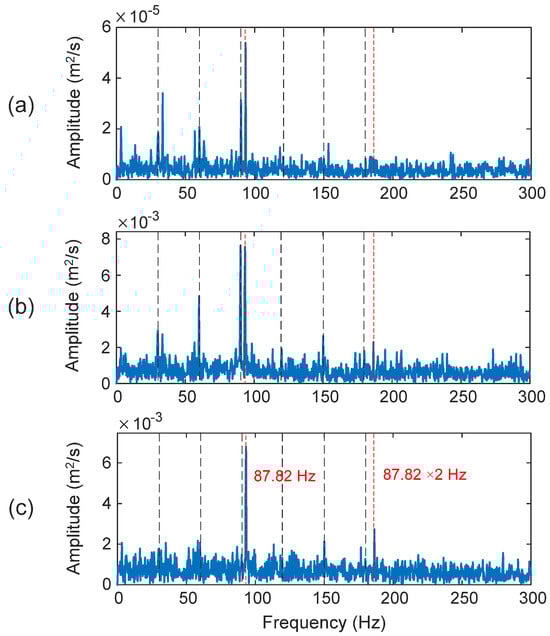 Processing results of a bearing with an outer race fault using the techniques of: (a) HHT, (b) TK, and (c) eTK. The red dashed lines represent fault characteristic frequency (87.82 Hz) and the black dashed lines represent shaft frequency (30 Hz) and its harmonics.