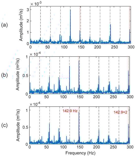 Processing results of a bearing with an inner race fault using the techniques of: (a) HHT, (b) TK, and (c) eTK. The red dashed lines represent fault characteristic frequency (142.9 Hz) and the black dashed lines represent shaft frequency (30 Hz) and its harmonics.