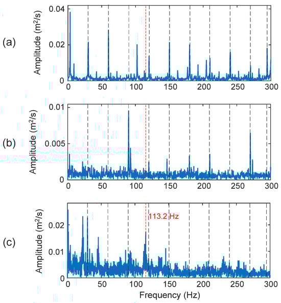 Detecting faults in a rolling element (a ball) is usually the most challenging task in bearing fault detection. In this case, the fault characteristic frequency is fBD = 113.2 Hz. The selected IMFs are the first, second, and third IMFs (i.e., IMF1, IMF2, and IMF3). As shown in Figure 14a,b, both the HHT and TK have failed to recognize the fault features to predict the bearing fault in this case, with DI = 12.4% and 7.6% for the HHT and TK, respectively. The proposed eTK, however, is the only technique that can provide some indication of the rolling element damage, as shown in Figure 14c, even though the feature does not dominate the spectrum (DI = 77.8%). It is because a ball rotates as well as slides, which makes the fault resonance modes change over time. The vibration patterns change when the damaged ball moves from the load zone to the unload zone. Complex impacts and vibrations are generated due to these effects.