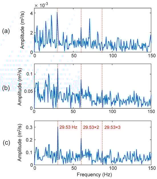 Processing results of healthy bearings using the techniques of: (a) HHT, (b) TK, and (c) eTK. The red dotted lines represent characteristic frequency (29.53 Hz) and its harmonics.