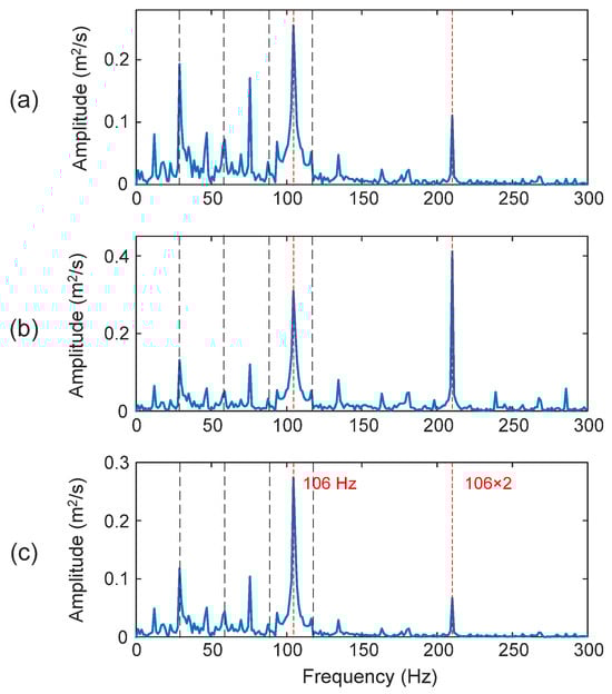 Processing results of a bearing with outer race fault using the techniques of: (a) HHT, (b) TK, and (c) eTK. The red dashed lines represent fault characteristic frequency (106 Hz) and the black dashed lines represent shaft frequency (29.53 Hz) and its harmonics.