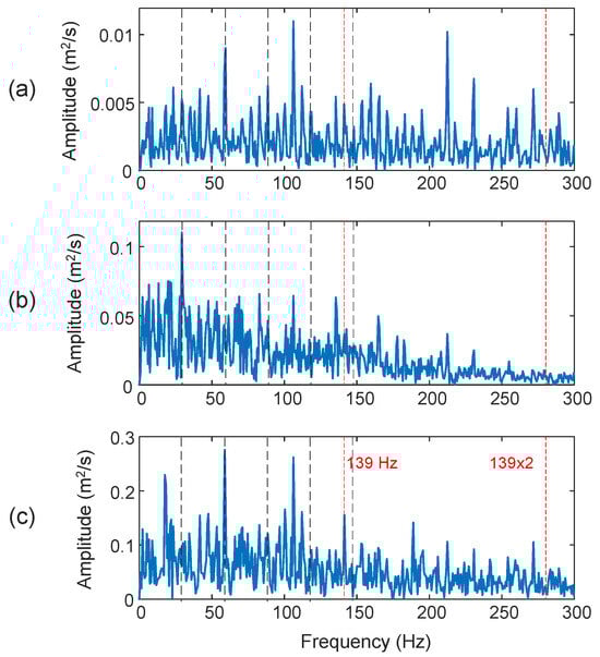 Comparison of processing results of a bearing with a rolling element defect using the techniques of: (a) HHT, (b) TK, and (c) eTK. The red dashed lines represent fault characteristic frequency (139 Hz) and the black dashed lines represent shaft frequency (29.53 Hz) and its harmonics.