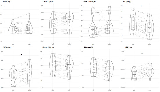 In the statistical analysis of the paired samples t-test (Table 3), F0 was significantly lower post-intervention than pre-intervention (−0.31 N/kg; 95% CI −0.58 to −0.05; p < 0.05; ES = −0.47) (Figure 2). In contrast, V0 was significantly higher in post than in pre (0.22 m/s; 95% CI 0.03 to 0.4; p < 0.05; ES = 0.49) (Figure 2), as was DRF (0.01%; 95% CI 0.001 to 0.01; p < 0.05; ES = 0.77) (Figure 2). There were no significant differences in the rest of the variables.