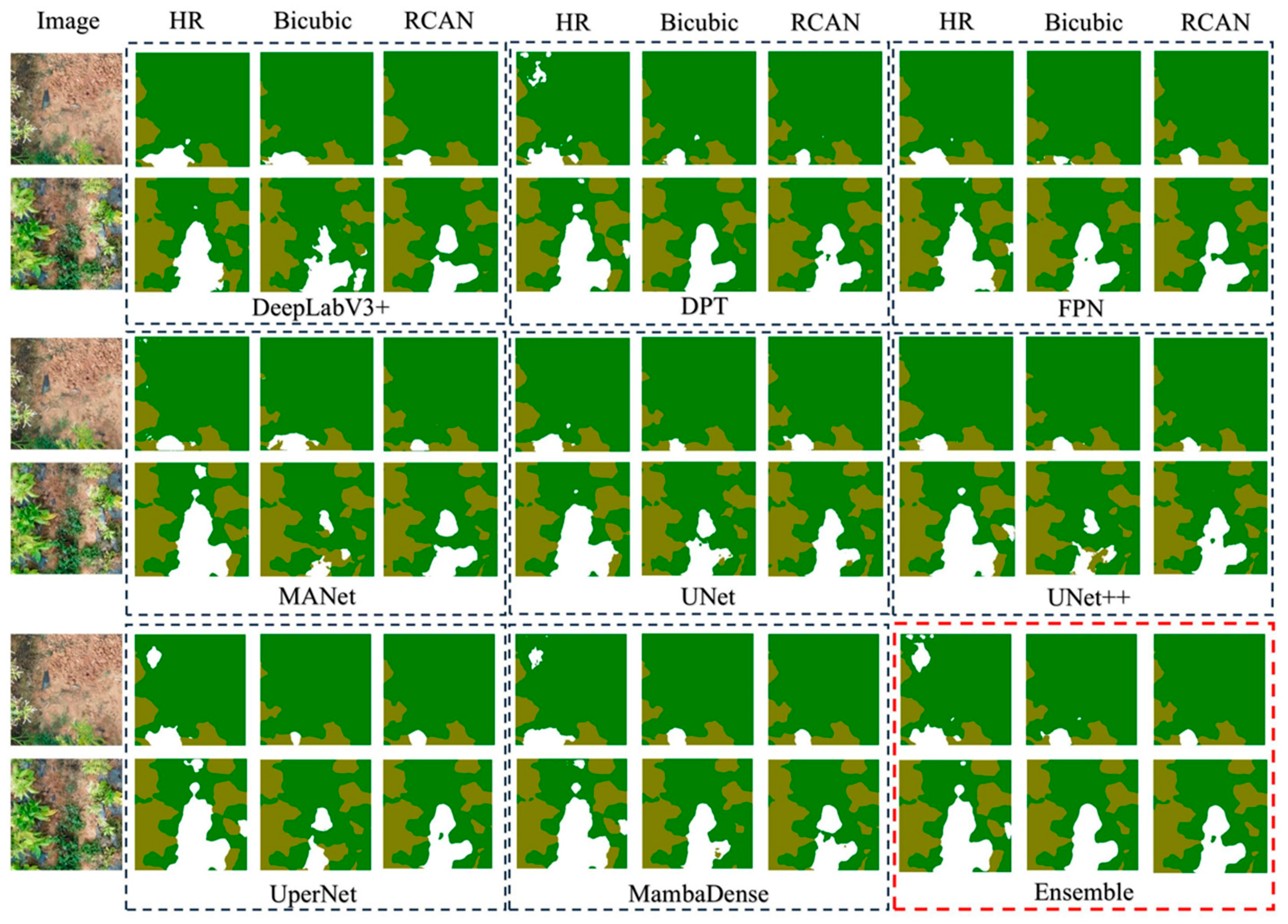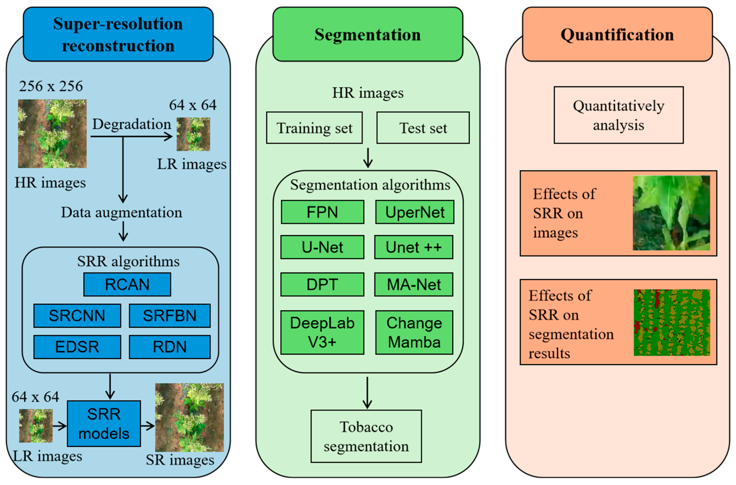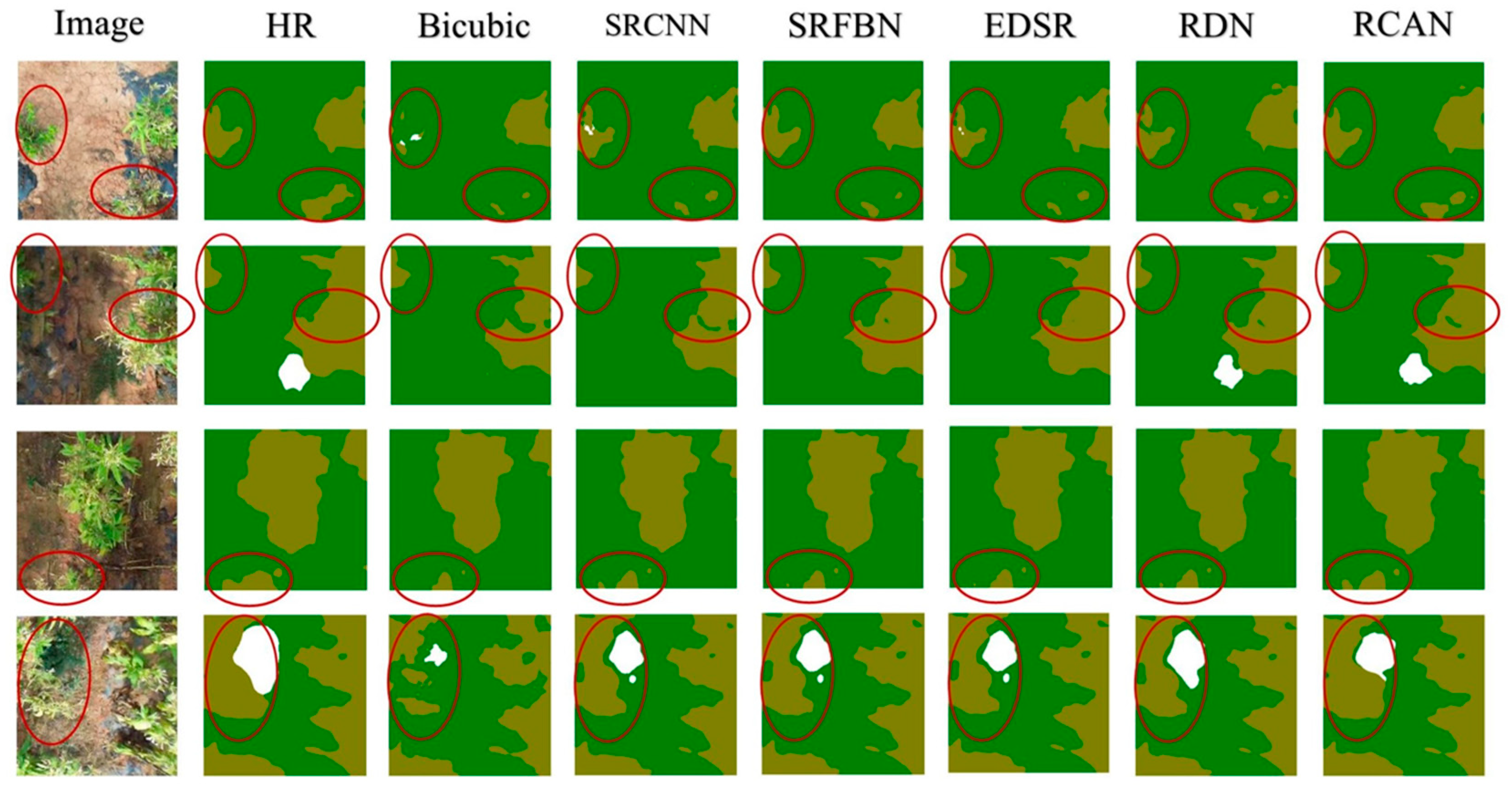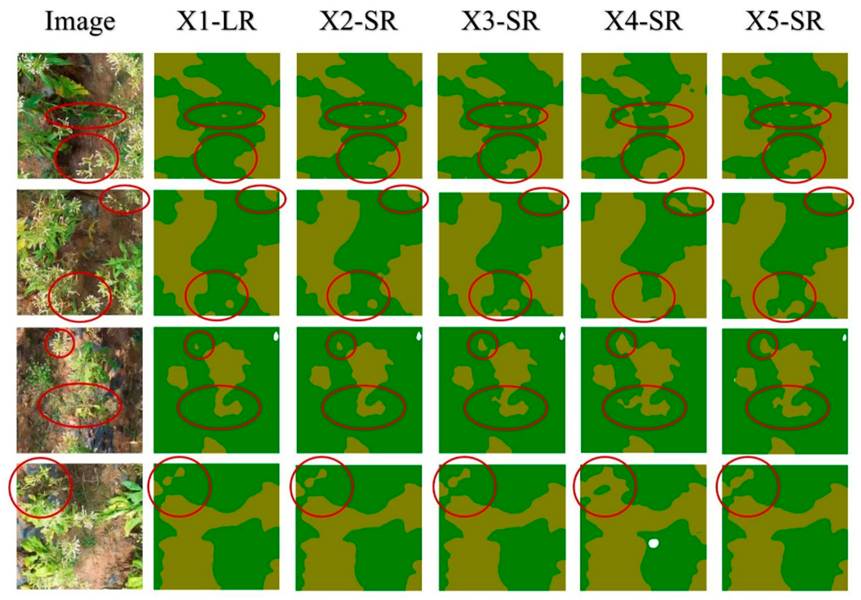 - Zhao, F.; Huang, J.; Liu, Y.; Wang, J.; Chen, Y.; Shao, X.; Ma, B.; Xi, D.; Zhang, M.; Tu, Z.; et al. A deep learning approach combining super-resolution and segmentation to identify weed and tobacco in UAV imagery. In Proceedings of the 2024 IEEE International Conference on Computer Science and Blockchain (CCSB), Shenzhen, China, 6–8 September 2024; pp. 594–597. [Google Scholar]