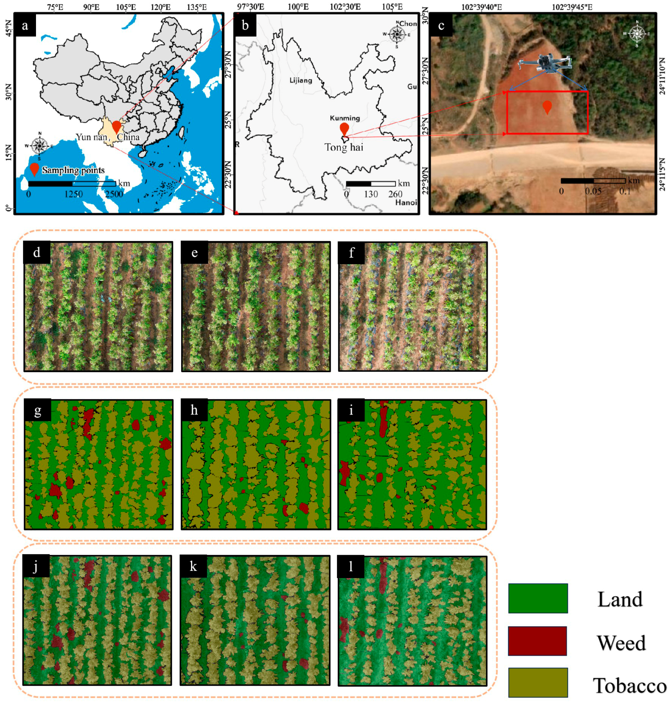 - Huang, L.; Wu, X.; Peng, Q.; Yu, X. Depth semantic segmentation of tobacco planting areas from unmanned aerial vehicle remote sensing images in plateau mountains. J. Spectrosc. 2021, 2021, 6687799. [Google Scholar] [CrossRef]