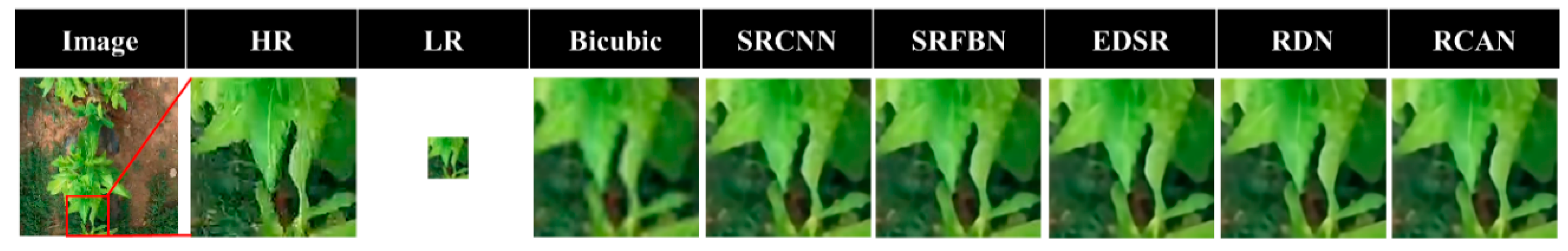 - Palan, V.A.; Thakur, S.; Sumith, N. Leveraging super-resolution technology in drone imagery for advanced plant disease diagnosis and prognosis. IEEE Access 2025, 13, 66432–66444. [Google Scholar] [CrossRef]