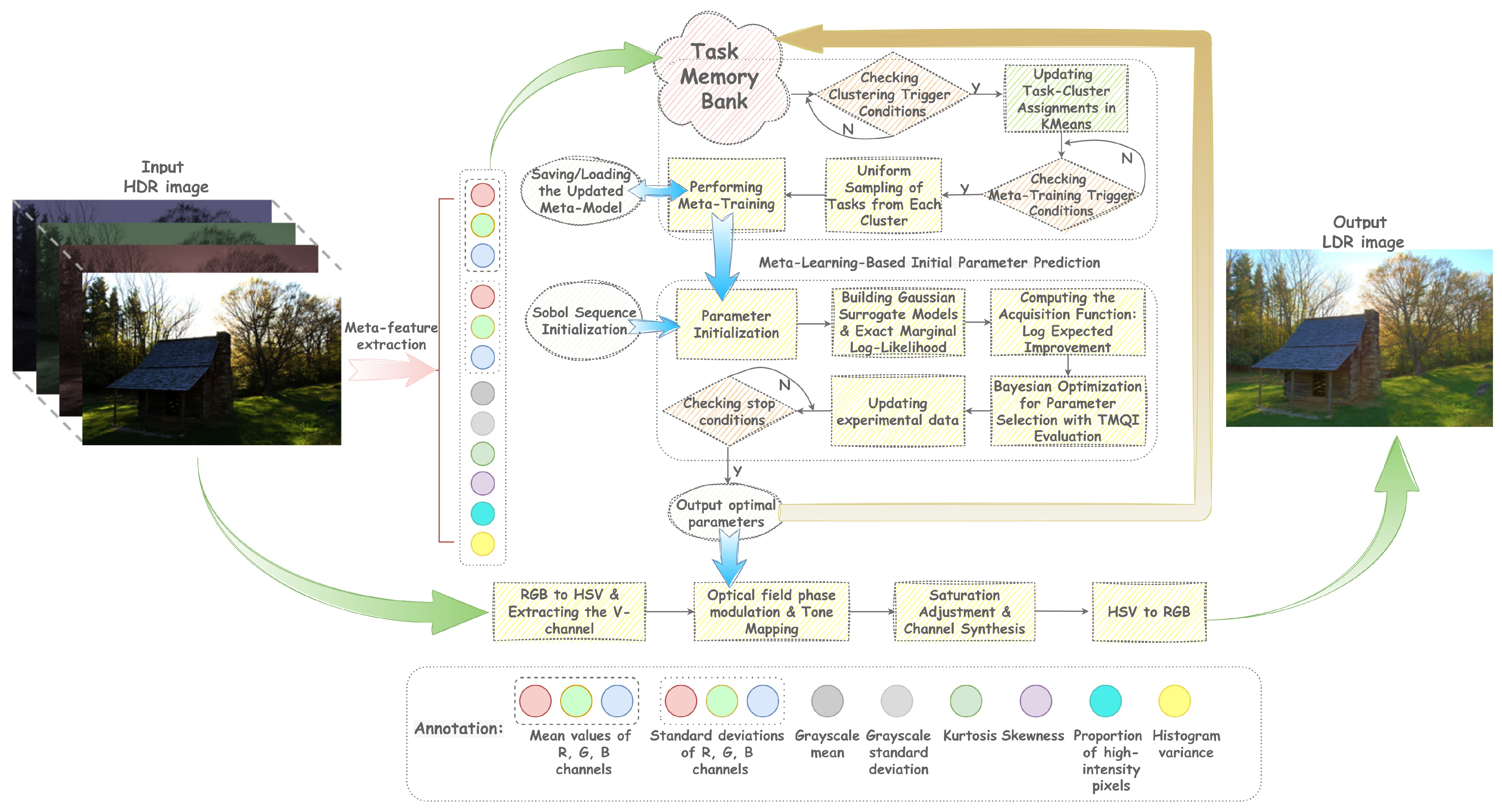This paper employs frequency-domain phase modulation of light fields and the Stevens power law, derived from psychophysics, as its core computational operators. The overall workflow is as follows: first, feature vectors capturing key attributes such as luminance distribution and local contrast are extracted from the input HDR image to guide the meta-learner in producing initial parameter estimates. Subsequently, taking these initial estimates as the starting point, the luminance channel undergoes a Fourier transform, phase modulation, and inverse transformation under a parameterized frequency-domain operator to generate a preliminary LDR luminance map. The resulting luminance map is then converted into final pixel intensities through coherent detection and a nonlinear transformation governed by the Stevens power law. This luminance map is subsequently fused with the chrominance channels to produce a candidate LDR image. Finally, an iterative parameter optimization is performed using a Bayesian optimization strategy that employs a Gaussian process as the surrogate model and integrates an information-driven acquisition function. At each iteration, a candidate image is generated through the aforementioned forward pipeline and evaluated using the TMQI metric. This process is repeated until convergence or until a predefined stopping criterion is satisfied, yielding the optimal parameters and corresponding results. The complete workflow of the proposed framework is illustrated in