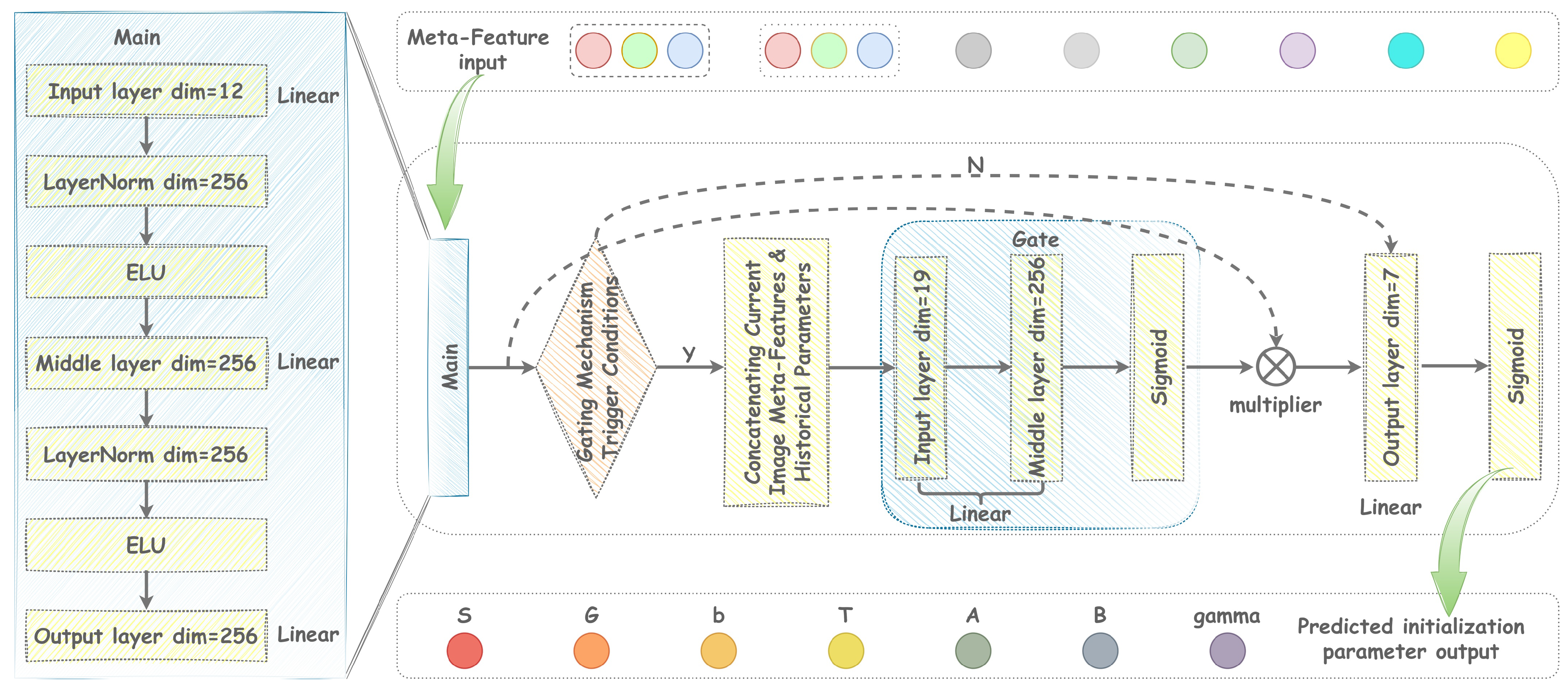 (3) To enhance the model’s generalization and task adaptability, we propose a task distribution-oriented meta-learning framework. A meta-feature space is constructed by extracting statistical features from input images and is integrated with a clustering mechanism to enable task-level grouping and episodic training. On this basis, a meta-learner equipped with a gating mechanism is employed for rapid parameter initialization and fast adaptation through a limited number of updates on new images, thereby improving the robustness and overall performance of the proposed method across HDR images exhibiting diverse content and characteristics, under the same computational budget. Furthermore, the transfer of prior knowledge in meta-learning accelerates convergence and alleviates the cold-start issue encountered in conventional Bayesian optimization.