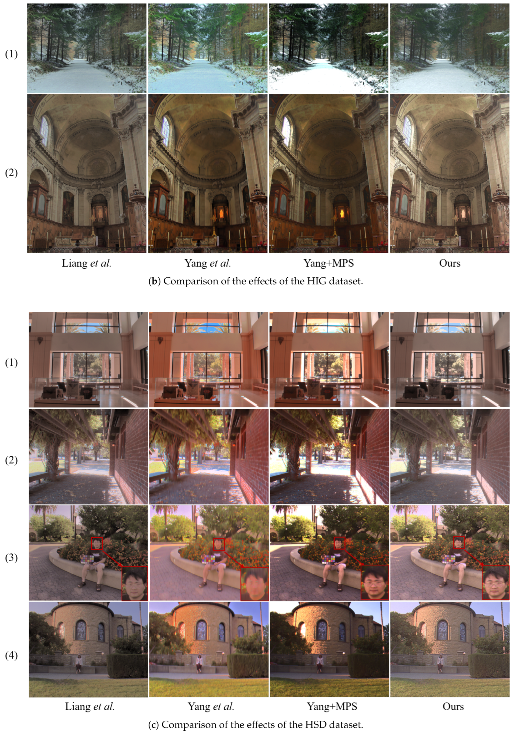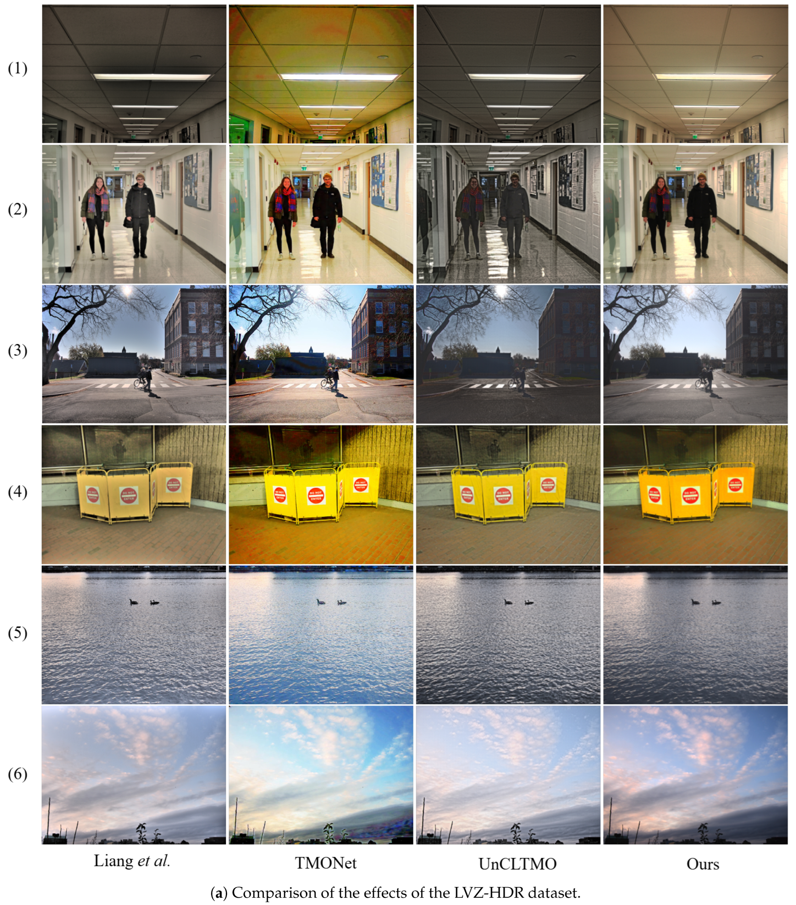 Figure 7 presents a comparison of the results of several mainstream and state-of-the-art tone mapping methods alongside our proposed method across three datasets. Liang et al.’s [