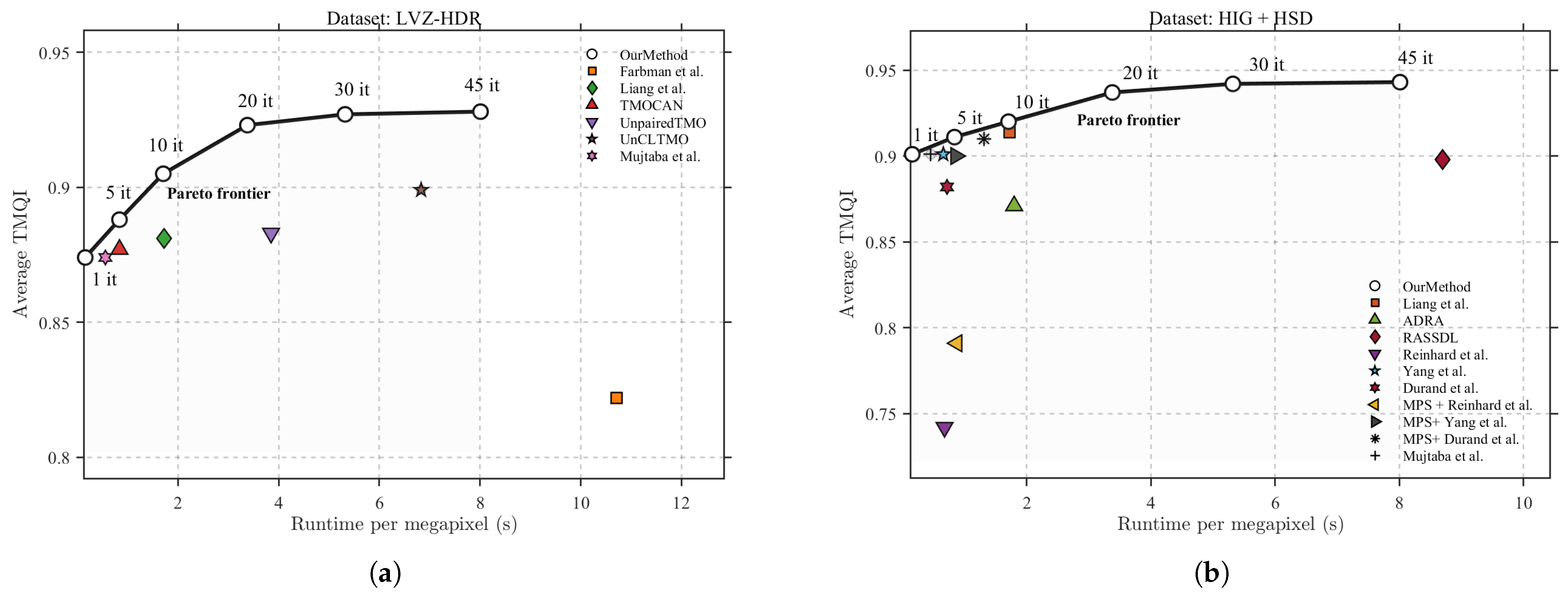Figure 8 illustrates a Pareto-front analysis in which the average TMQI is plotted against the runtime per megapixel. Each data point represents a specific method evaluated under the experimental conditions detailed in