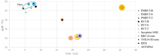 Overall, across both datasets, PMRVT delivers a favorable accuracy–efficiency trade-off, achieving higher mAP than RVT [11] and other CNN/RNN or Transformer baselines [7,8,12,18,27,28,29,30,31,32,33], while also reducing latency. Detailed results can be found in Table 3.