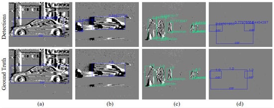 Predictions on the Gen 1 dataset. All examples are picked to illustrate the detection results of different-sized targets in the Gen1 dataset. (a–c) illustrate detection results for large, medium, and small targets, respectively, in the Gen1 dataset; (d) shows the situation where the model can successfully identify targets even when the number of events is insufficient for detection.