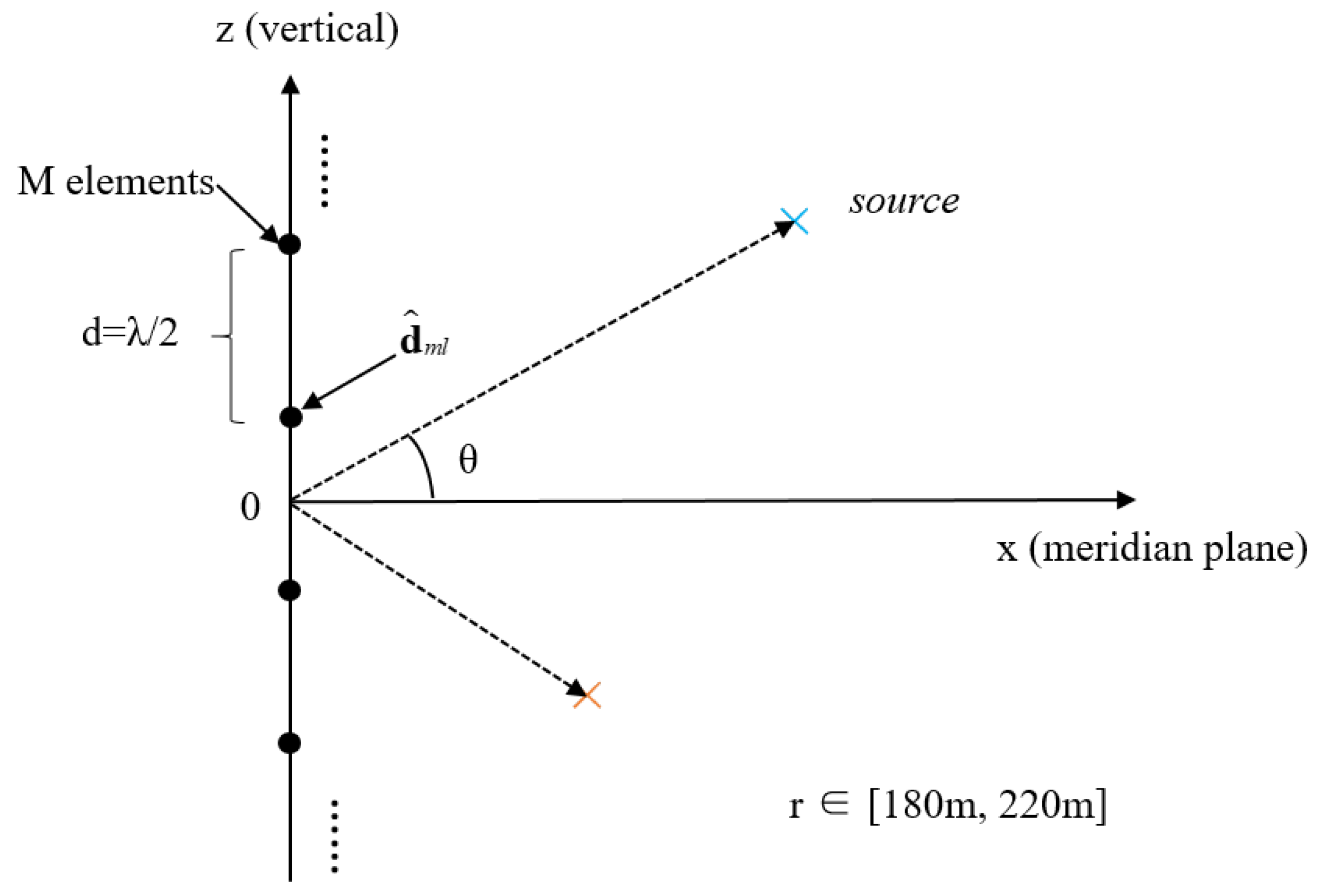 Figure 1. Schematic illustration of the array and sound sources. The black dots represent the hydrophone elements of the vertical array, while the blue and orange crosses denote the sound sources located at different elevation angles.