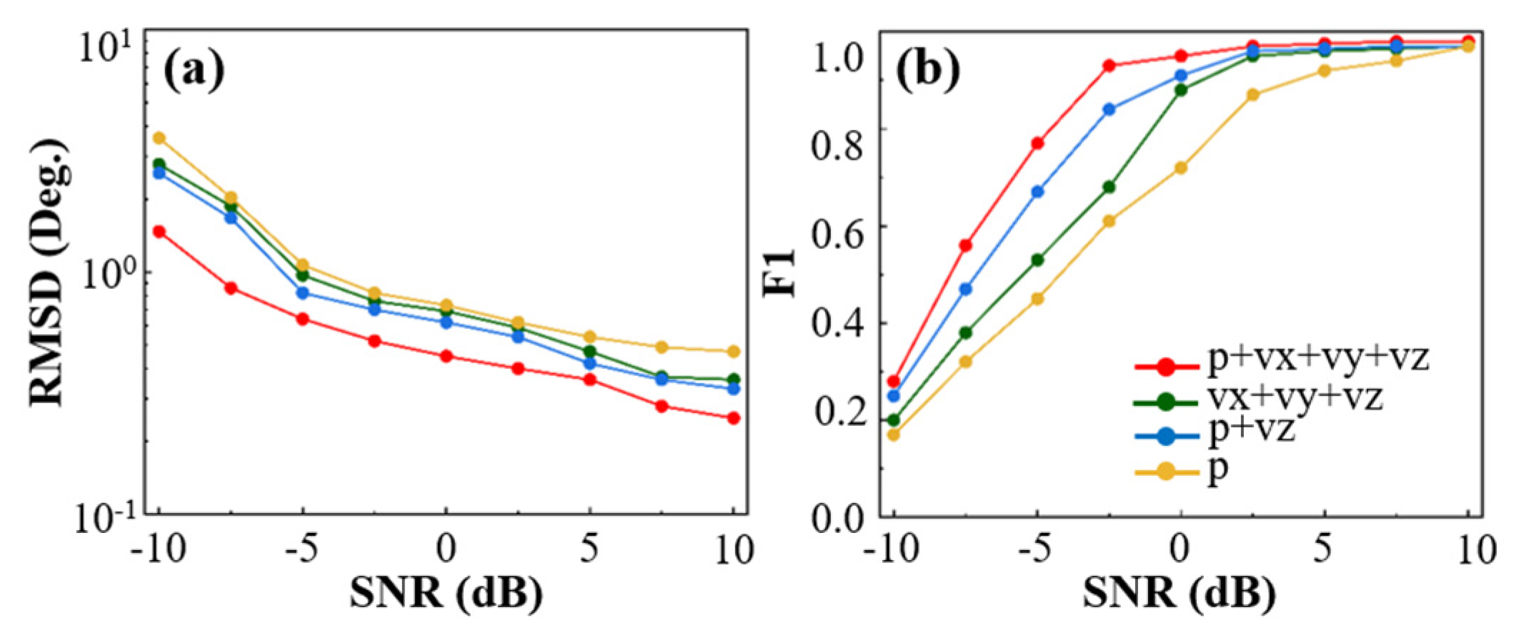 To investigate the performance variation in elevation angle estimation under different acoustic input channel settings, this study four input channel configurations were analyzed: (1) pressure-only channel p , (2) pressure and vertical particle velocity p + v z , (3) particle velocity components v x + v y + v z , and (4) full input channels p + v x + v y + v z . The pressure and particle velocity features were concatenated along the channel dimension and then fed into the model. Each input—pressure p and velocity components v x , v y , v z —was represented by its complex-valued signal, decomposed into real and imaginary parts and concatenated by channel. For example, with the full combination p + v x + v y + v z , the model receives complex features from four physical channels (each split into real and imaginary parts), resulting in eight total input channels. This approach preserves the physical distinctiveness of each input while enabling multi-source cooperative feature learning within the network. All experiments were conducted under a snapshot number T = 500 . The SNR varied from −10 dB to 10 dB in 2.5 dB steps, resulting in nine discrete levels. To evaluate performance across diverse noise conditions, Root Mean Square Error (RMSE) and F1-score were adopted as the primary metrics.