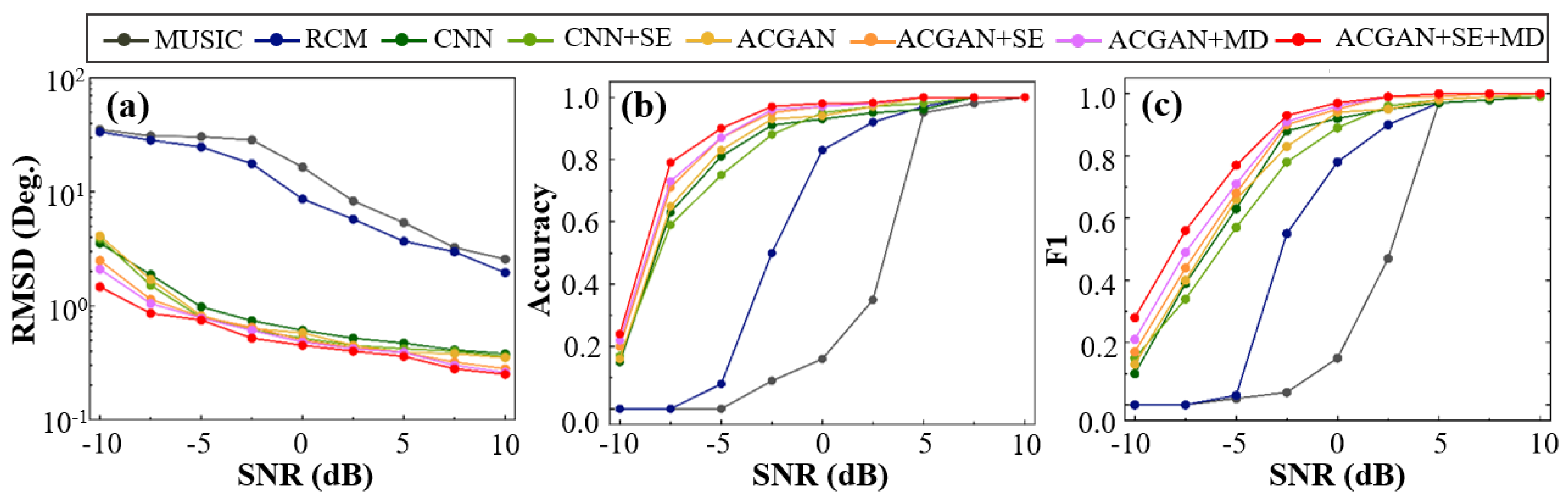 SNR (dB)MUSICRCMCNNCNN + SEACGANACGAN + SEACGAN + MDACGAN + SE + MD
