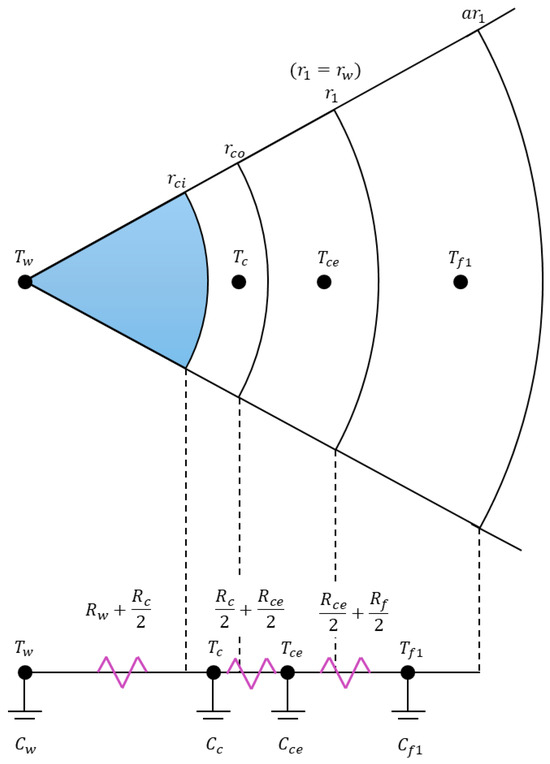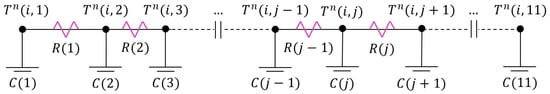 where j = 4, …, 13. It should be noted that R(j) represents only a portion of the total thermal resistance. Specifically, corresponds to the thermal resistance, while the factor is already incorporated into the governing equations in Equations (2) and (10).