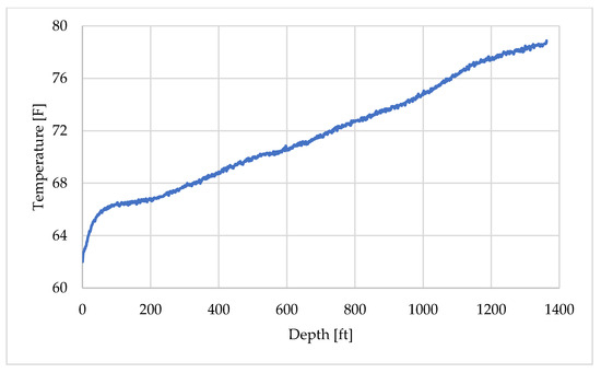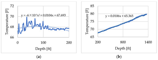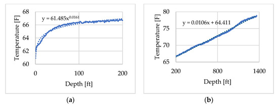Similarly, the DTS temperature profile recorded at 09:25:36 shown in Figure 9, was selected to represent the geothermal gradient for the other layers. This time was chosen because the record was obtained prior to 09:34 and therefore reflects the undisturbed geothermal gradient. A slight temperature drop can be observed very close to the wellhead, which is attributed to the cold weather conditions at the time of measurement, as the experiment was conducted in early March. The profile was also divided into two depth intervals and assigned using fitted approximation curves, as illustrated in Figure 10a,b.