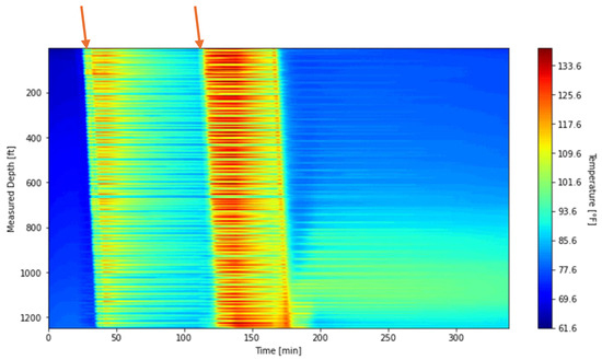 Figure 11 presents the DTS waterfall plot along the well for the entire circulation test. The DTS measurements were recorded from 09:25:36 to 15:04:26. The plot clearly captures two thermal slugs, generated by separate hot-water injection events, which are indicated by the orange arrows.