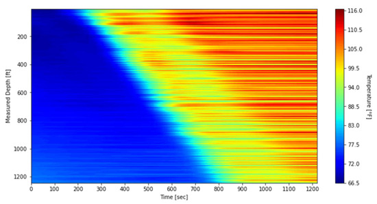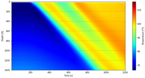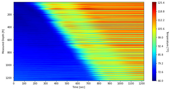 To mitigate the impact of these banding effects on the subsequent thermal slug velocity extraction discussed in Section 3.2, the data was processed using a depth-averaging method applied to the first warm-up period. The unprocessed waterfall plot, covering DTS measurements from 09:47:59 to 10:08:20, is shown in Figure 12, while the processed results are presented in Figure 13. In this processing step, the original 1496 temperature measurement points were grouped into 187 sections, with each section representing the average of eight fiber-optic channels at each timestep. For comparison with these field-based waterfall plots, the simulated result is also presented in Figure 14.