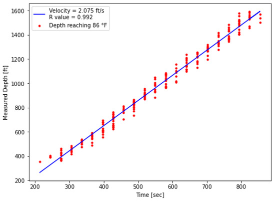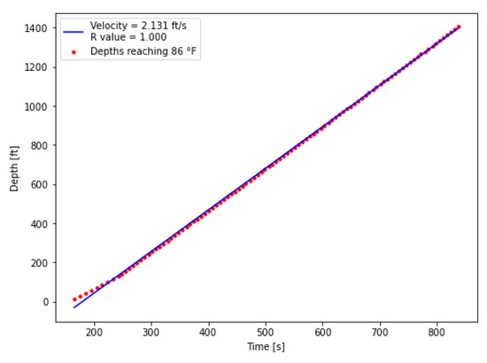 For the extraction, the processed DTS data shown in Figure 13 was used. Prior to hot-water injection during the first warm-up period, the tubing fluid temperature was below 80 °F along the wellbore (Figure 9). A threshold temperature of 86 °F was defined to identify the arrival of the thermal front. At each measurement point, the time at which the temperature first exceeded this threshold was recorded and plotted on a time–depth diagram. A linear regression was then applied, and the slope of the fitted line provided the velocity estimate. As shown in Figure 15, the red dots represent threshold measurement points while the blue line indicates the fitted velocity which were estimated from the measured DTS data.