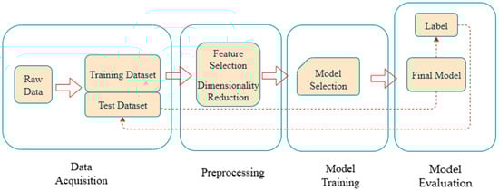 The workflow for constructing a machine learning model is illustrated in Figure 2 and typically consists of four key stages: data acquisition, preprocessing, model training, and model evaluation. Data serve as the foundation for model training. In coal mine disaster prediction, data sources mainly include online monitoring sensors, geological survey records, historical accident data, and video or image surveillance. Since raw data often contain missing values, anomalies, and noise, preprocessing techniques such as data cleaning and feature engineering are required to ensure reliability in subsequent modeling. Feature selection and feature extraction play a critical role in determining model performance. Feature selection methods are commonly employed to eliminate highly correlated variables, while techniques such as principal component analysis (PCA), gray theory, and multiple imputation are used for dimensionality reduction and feature representation optimization, thereby enabling the model to learn more efficiently. During the model training stage, different algorithms are selected depending on the task objectives. Table 1 summarizes commonly used algorithms, their application scenarios, and associated strengths and weaknesses. In the model evaluation stage, a series of metrics are typically applied to validate reliability. For classification tasks, accuracy, precision, recall, and the F1-score are frequently used to assess predictive performance. For regression tasks, mean squared error (MSE), mean absolute error (MAE), and the coefficient of determination () are commonly adopted to evaluate model fit. In addition, robustness and real-time performance must be considered to ensure that models can operate stably under the complex and dynamic conditions of underground coal mines.