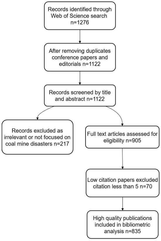 To further explore the current research priorities and technological trends of AI in coal mine disaster prediction, this study performed a comprehensive bibliometric retrieval and analysis based on the Web of Science (WoS) Core Collection database. The specific flowchart is shown in Figure 4. The search was conducted on 15 July 2024, with the following query string applied to the “Topic” field (including title, abstract, author keywords, and Keywords Plus): TS = (“coal mine” AND disaster AND prediction AND (“artificial intelligence” OR “machine learning” OR “deep learning” OR “neural network” OR “intelligent system”)). The search was limited to the period from January 2013 to June 2024, and only journal articles and review papers written in English were included. Conference papers, editorials, and duplicates were excluded. A total of 1276 records were initially retrieved. After removing irrelevant and low-citation papers (less than five citations) and those unrelated to coal mine disaster prediction, 835 publications were retained as “high-quality” publications. The bibliometric analysis was conducted using VOSviewer (version 1.6.20). The overall screening and selection process is summarized in Figure 5.