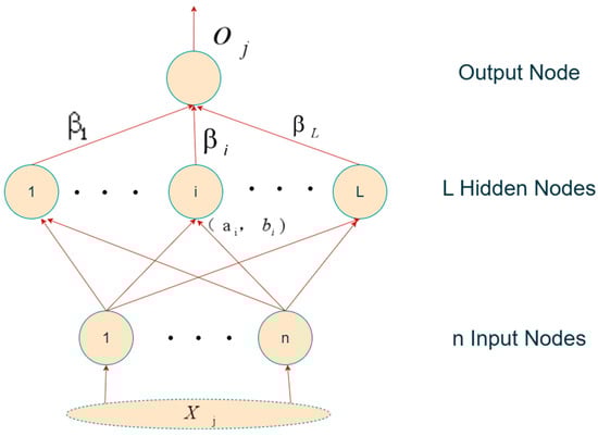 Extreme Learning Machine network structure diagram. This diagram illustrates the architecture of a neural network model. There are n input nodes that receive input data . These input nodes are connected to L hidden nodes, with each hidden node i characterized by parameters . The hidden nodes then connect to an output node , and the connections between hidden nodes and the output node are weighted by , , .