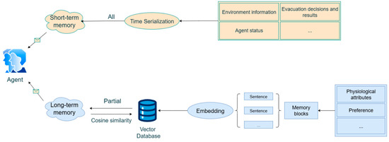 Design of agent’s long-term and short-term memory. Information including environment details, evacuation decisions and results, and Agent status undergoes time serialization and is fully stored in the Agent’s short—term memory. For long—term memory, sentences are embedded to form a vector database. Partial content from this database, selected via cosine similarity, is stored in the Agent’s long—term memory. The Agent also incorporates elements like physiological attributes and preferences, which interact with memory blocks.