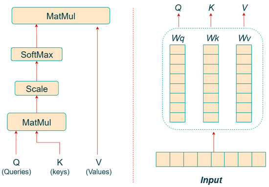 Self-attention architecture diagram. On the left, it shows the computation flow: Queries (Q) and Keys (K) first undergo a matrix multiplication (MatMul), then are scaled, passed through a SoftMax function, and finally multiplied with Values (V) via another matrix multiplication to achieve the output. On the right, it depicts how the input is transformed into Q, K, and V using weight matrices , and , respectively.