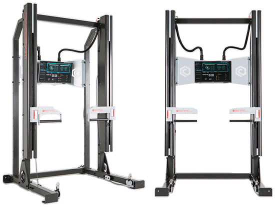 All testing was performed on a modified, isokinetic-based Smith machine as shown in Figure 2 (XIM Machine, Ronfic Inc., Busan, Republic of Korea). The machine was calibrated according to the manufacturer’s specifications prior to data collection. The bench press range of motion (RoM) was standardized for each participant as shown in Figure 3: