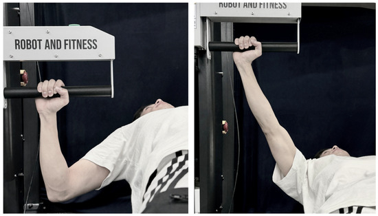 Following a warm-up session at a velocity of 0.7 m/s, the main protocol consisted of 7 sets of 8 repetitions performed at a velocity of 0.3 m/s to induce fatigue. Each repetition involved a concentric phase from the starting position to full elbow extension, followed by an eccentric phase returning to the start position in Figure 3. Eccentric loads were adjusted to each participant’s self-reported 7-repetition maximum (7RM) using the machine’s electronic resistance adjustment system. Rest intervals of two minutes were provided between sets. Testing concluded after the completion of the seventh set.