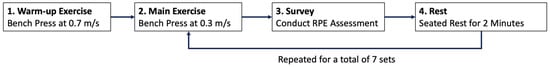 - Main exercise—Bench press at a controlled velocity of 0.3 m/s to induce fatigue, executed with the participant’s self-reported 7-repetition maximum (7RM) load.