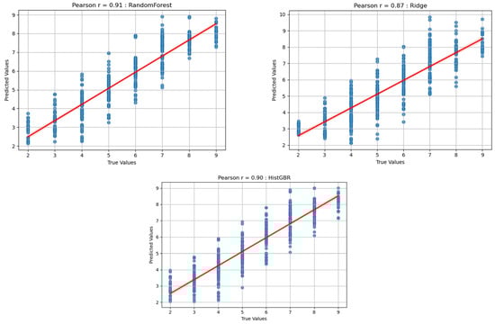 Figure 5 shows the scatter plots depicting the relationships between the predicted and actual RPE values for the three regression models: Random Forest (RF), Histogram-based Gradient Boosting Regression (HistGBR), and Ridge Regression (RR). Each plot includes a fitted regression line along with the Pearson correlation coefficient (r), which quantifies the agreement between predicted and true values.