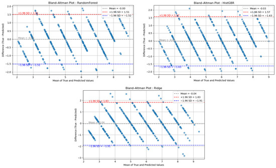 Furthermore, the error-bucket analysis confirmed that the vast majority of deviations fell within the ±1 range, with only a few cases exceeding ±2, thereby underscoring the model’s practical utility. These findings are consistent with previous fatigue prediction studies employing Bland–Altman (B&A) analysis [27,39,40], as shown in Figure 6. The results indicate that the mean difference between predicted and actual fatigue values was close to zero, and that most deviations lay within the 1.96 standard deviation (SD) limits of agreement. Specifically, participants exhibiting strong Pearson correlations showed narrow error bounds (approximately −0.5 to 0.5 units), whereas those with moderate or weak correlations demonstrated wider limits, typically ranging from ±1 to ±2 units.
