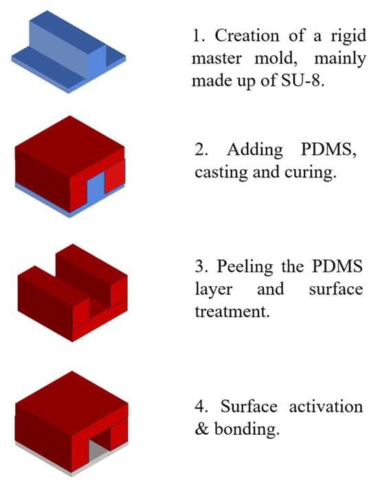 Soft lithography is a cost-effective and widely adopted technique for fabricating microfluidic and optofluidic devices, especially those made from elastomeric materials. Soft lithography is considered a flexible alternative to conventional photolithography. It facilitates rapid prototyping and scalable production without the need for expensive cleanroom facilities [48,49].